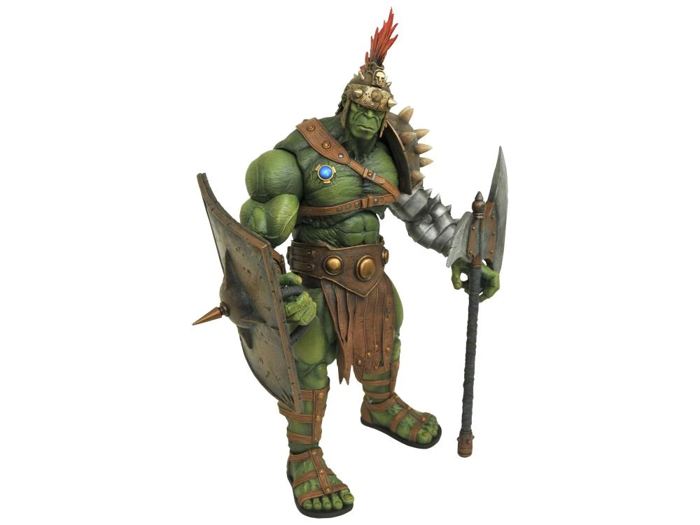 This huge figure stands approximately 10 inches tall (11.5 inches with his feather crest helmet!) and features 16 points of articulation, allowing him to strike a wide variety of combat-ready poses. Hulk comes armed with his weapons: an 8-inch-long battle axe and a 5-inch tall spiked shield!